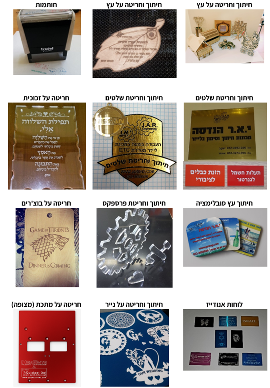 מכונת לייזר לחיתוך וחריטה במגוון רחב של חומרים — עץ, פלסטיק, פרספקס, גומי לייצור חותמות, מוצרי פרסום, שלטים ועוד אינספור יישומים.